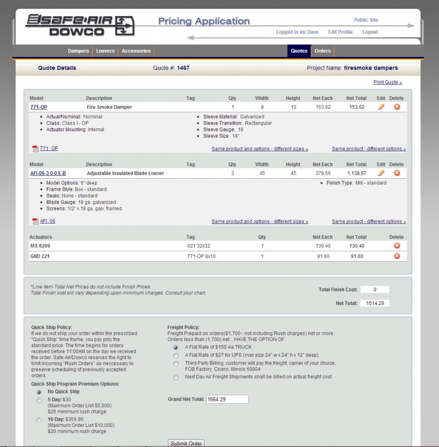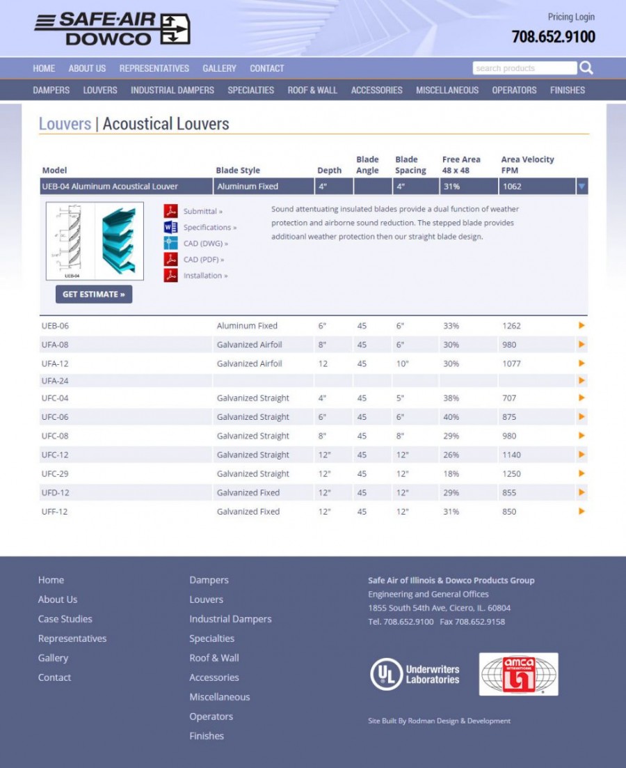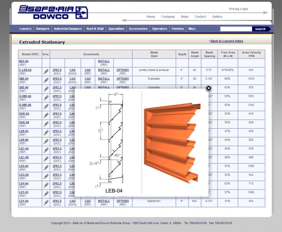 Safe Air - Dowco is a major damper and louver manufacturer. This website enables contractors and architects to check out products and download catalog pages, performance charts, and more. Rodman Design has also built an extranet pricing application for Safe-Air's sales staff. It enables representatives to build and save quotes, submit orders, keep track of their accounts and calculate costs.